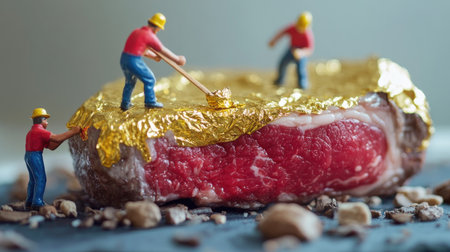 This unique food art photograph features miniature workers applying gold leaf on a juicy steak. Surrounded by nuts and chocolate, the scene combines creativity with culinary indulgence.