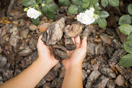 Hands Holding Flowers And Plants With Bark Mulch