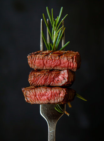 Three slices of grilled steak on a fork with steam rising, close-up.