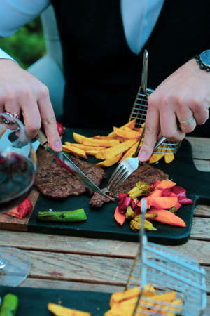 Chef cutting steak with a knife on a plate in a restaurant