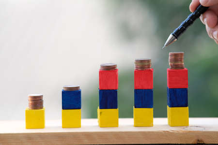 The hand of a businessman draws a line of coins with a pencil. The concept of economic growth.
