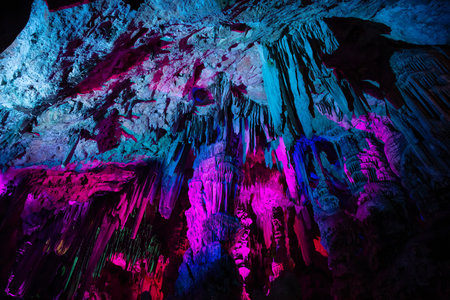 Colorful stalactites and stalagmites in a cave