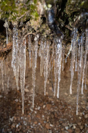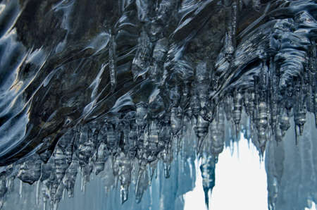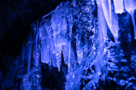 Ice stalactites in the cave, close-up. Natural background