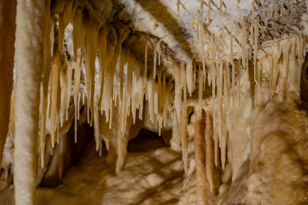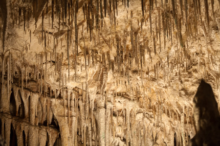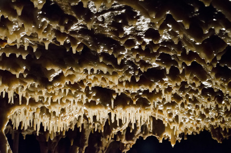 Cave texture background with Stalactite and Stalagmite Formations in the Dim Cave in Alanya, Turkey
