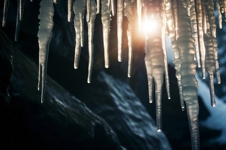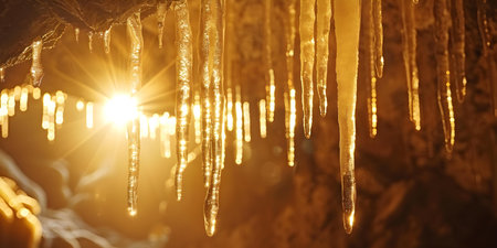 Sunlight shining through icicles, creating a glowing effect against a dark background. Generative AI