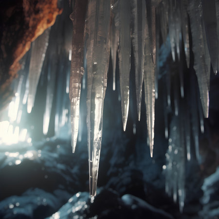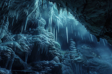 Glowing ice stalactites hang from cave ceiling illuminated by soft blue light showcasing natures beauty in a hidden underground world.