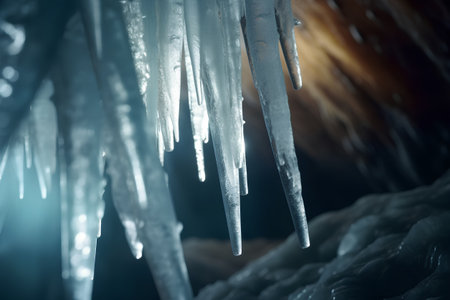 Captivating close-up of hanging icicles, featuring intricate textures and blue lighting against a dark stone wall. Perfect for winter designs.