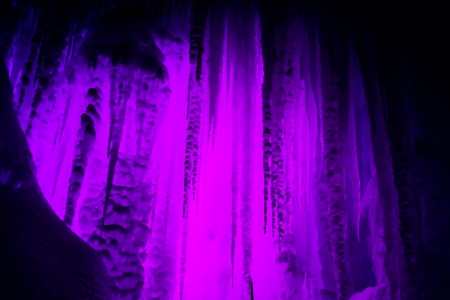 Abstract ice and icicles formations on cold winter night covered in snow and pink colored lights