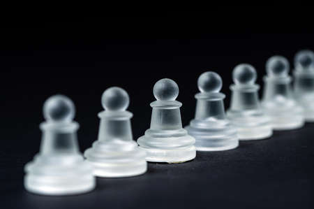 opaque glass chess pawn row on black background, selective focus, close-up