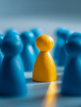A vibrant yellow game token rises among a cluster of blue counterparts, highlighting individual strength and distinctive leadership amid a softly blurred backdrop.