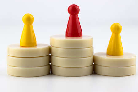 Yellow and red plastic pawns on a white background. The concept of leadership