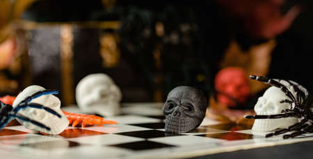 Halloween party set up props. White and black sculls on chess board. Death symbol. Fear and horror concept. Dia de los Muertos and Halloween. Dark themed copy space