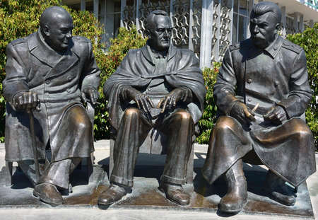 YALTA, CRIMEA - OCTOBER 11, 2017: Churchill, Roosevelt, Stalin at the Yalta Conference of 1945. The statue of Zurab Tsereteli in the territory of the Livadia Palace.