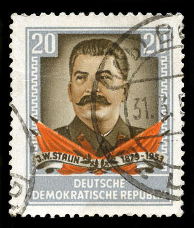 EAST GERMANY - CIRCA 1950s: A vintage postage stamp from the Deutsche Demokratische Republik (East Germany) featuring a portrait of Soviet Union leader Jospeh Stalin, circa 1950s.