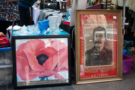 Moscow, Russia - 14 September 2020, Izmailovsky antique market. Old things for sale. Portrait of Lenin for sale