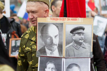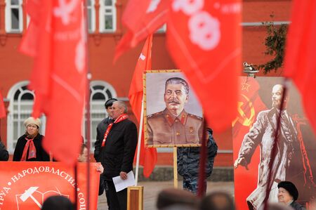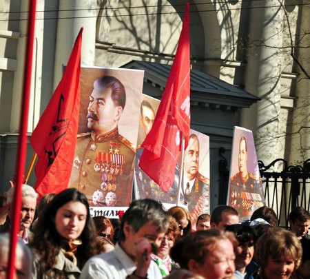 ST. PETERSBURG, RUSSIA - MAY1: Man with portrait of Soviet dictator Josef Stalin takes part in the May day demonstration in May 1, 2010