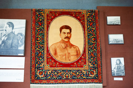 Gori, Georgia - August 31, 2021: Stalin portrait carpet in the Joseph Stalin Museum in Gori, Georgia. It dedicated to the life of Joseph Stalin, the leader of the Soviet Union.
