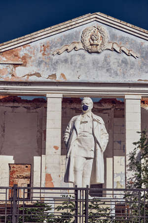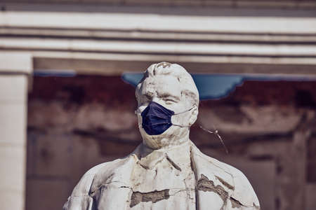 Astrakhan / Russia - May 29, 2020: Monument to one of the Bolshevik revolutionaries Kirov in a medical mask. Park in the city of Astrakhan, Russia. High quality photo