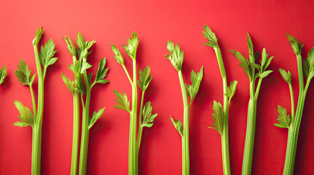 A stunning display of fresh green celery stalks arranged vertically on a bold red background, perfect for promoting healthy eating and culinary inspiration.