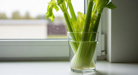 Fresh celery in a glass vase on the windowsill.