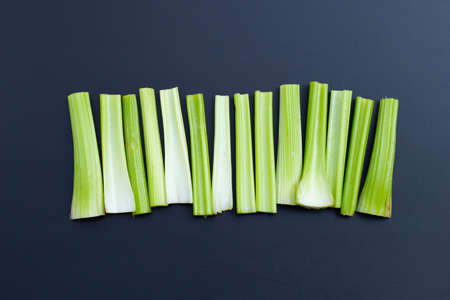 Fresh celery on dark background. Top view