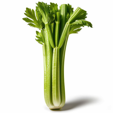 A vibrant bunch of fresh celery stalks stands tall against a clean white background, perfect for showcasing healthy cooking options and nutritious recipes.