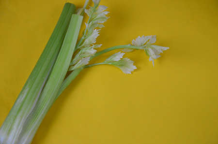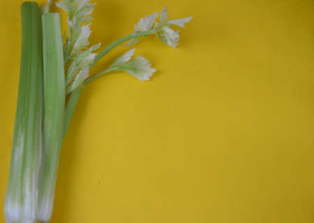 Fresh green celery on yellow background, close up
