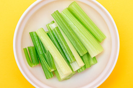 Fresh Chopped Celery Sticks with Water Drops in White Bowl on Yellow Background - Top View. Vegan and Vegetarian Culture. Raw Food. Healthy Diet with Negative Calorie Content