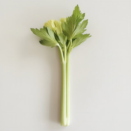 Bright green celery stalk lies flat on a neutral surface, highlighting its crunchy texture and fresh foliage. The vibrant leaves add a healthy touch to any culinary preparation.