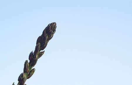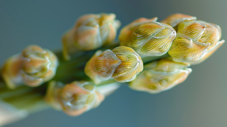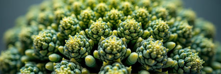 A close up of a bunch of green buds on a plant. The buds are small and tightly packed together, giving the impression of a fresh, new growth. Scene is one of growth and vitality