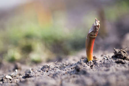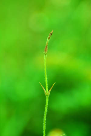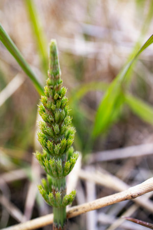 Field horsetail sprout with dew drop closeup selective focus on blurred dry grass swamp background
