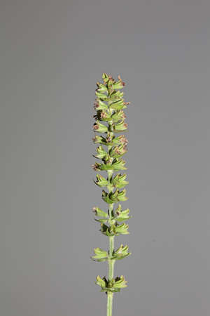 A close-up image of a sage plant in bloom, showcasing the delicate white flowers and detailed texture of the plant. The flowers are in full bloom, and the image focuses on the intricate details of the flower structure and the plant's stem. The background is blurred and dark, allowing the viewer to focus on the plant itself.