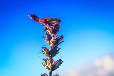 Fluffy golden reeds on turquoise blue sky background. Trendy natural red pampas grass botanical background for poster wallpaper design. Dry reed on the lake. Beautiful autumn nature sunny day weather.