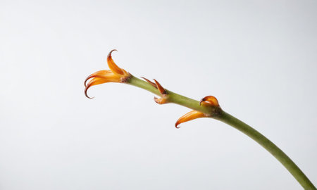 A single stem of a bird of paradise flower, with a water droplet on its green stem, grows towards the light