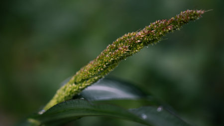 A close-up of green wheat, showing the detailed texture and subtle colors in each ear of grain. The background is blurred to focus on the vibrant hues of the grains. --chaos 30 --ar 16:9 --stylize 750 --v 7 Job ID: 2f6224a5-a280-4d07-8294-95664b47a890