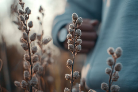 Close-up of plant buds in foreground, person with watch blurred background, focusing on the growing process and emphasizing personal growth or development, shot using Canon EOS R5 camera with macro lens, f/20 aperture for detailed texture capture, natural daylight lighting to highlight colors and textures, --ar 3:2 --v 6.1 Job ID: f3efb1cd-6af3-4b83-8e93-cd1736662a86