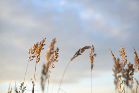Field with wild grasses at sunset. Selective focus. Beautiful summer landscape, rural nature.