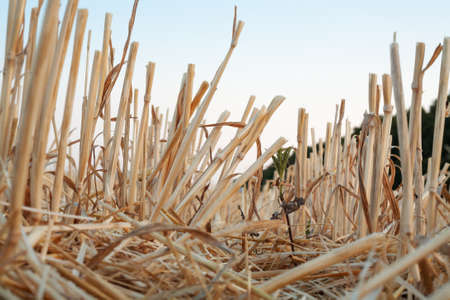 Wheat field. Yellow field against the sky. Cut wheat close up