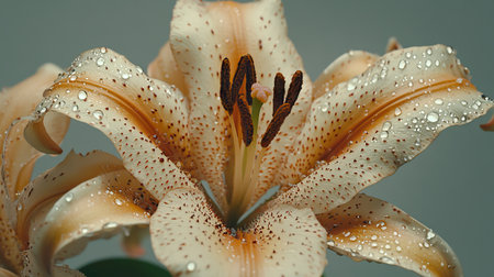Detailed close-up view of a lily petal, showcasing its intricate texture and the glistening water droplets clinging to its surface. The petal's color is a soft blend of beige and orange tones.