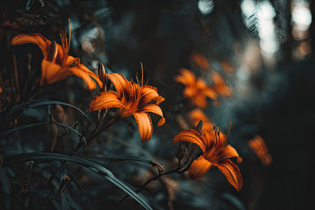Vibrant orange lilies in a tranquil, beautifully blurred botanical garden