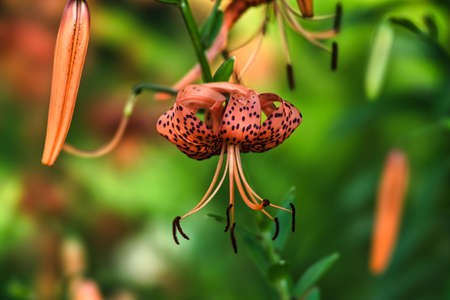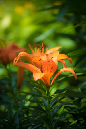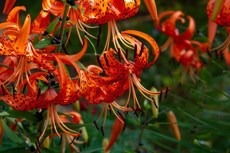 Garden tiger lilies, Lilium lancifolium, syn. L. tigrinum, summer natural background, selective focus, shallow depth of field