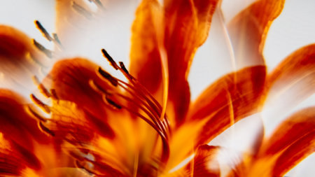 Lily botany. Floral art. Defocused red yellow color flower nature plant bud motion on abstract creative blossom white light background.