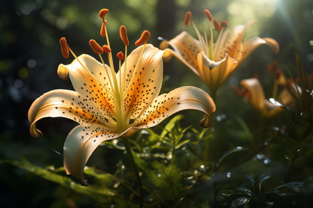 Close-up of vibrant tiger lilies with sunrays filtering through the foliage