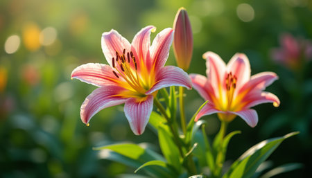 A stunning close-up of pink lilies with vibrant yellow centers, illuminated by soft golden sunlight. The delicate petals glisten with dew, creating a serene and enchanting atmosphere in a lush green garden.