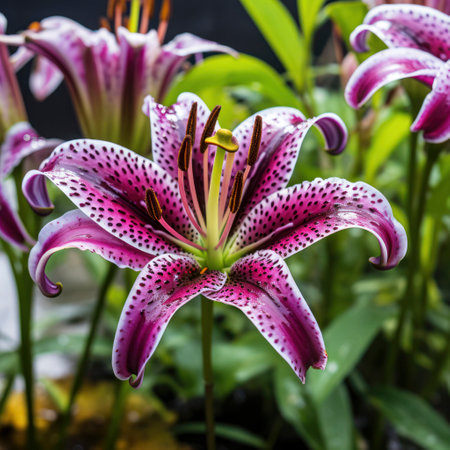 Vibrant lilies in full bloom with intricate patterns on petals.