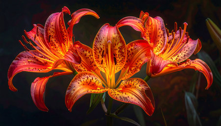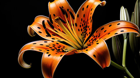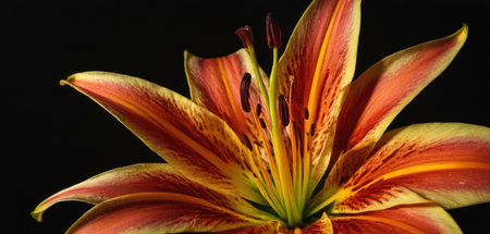 A close-up captures a blooming lily, showcasing vivid colors across its petals and leaves. The composition highlights the flower against a stark black backdrop. Its style presents a high contrast. Ideal for illustrating themes of beauty, nature, or artistic design, it is suitable for various commercial or decorative applications.