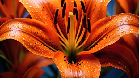 Vibrant Orange Lily on Blue Background Floral Beauty, Springtime Blooms, Copy Space for Design