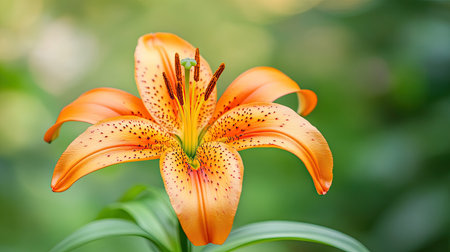 Vibrant orange tiger lily in full bloom with dark spotted petals yellow center