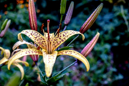 Russia. Chita region. Blooming American lily on the dacha plot of the village of Gold Priisk on the bank of the Chikoy River.