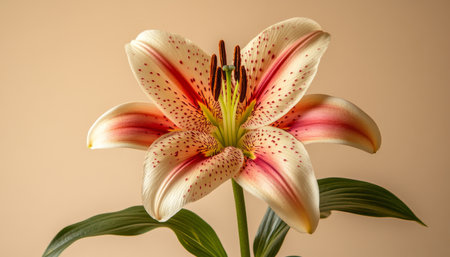 Close Up of a Beautiful Pink and White Lily Flower on a Beige Background with Copy Space